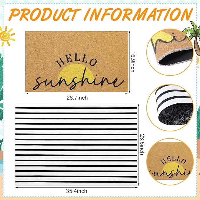 2 Pcs Door Mat Yellow Welcome Non Slip Coir Mats Stripe Floor Layering Doormats Seasonal for Front Porch Entryway Decor(Sunshine)