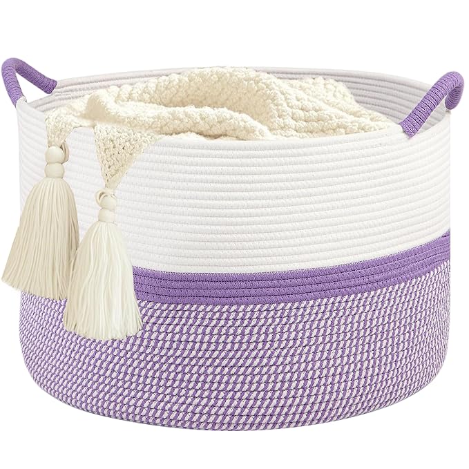Laundry Basket,20''x13''Large Woven Cotton Rope Storage Basket,Nursery Laundry Hamper,Blanket Basket for Living Room;Kids hamper,Multi-Purpose Organizer for Laundry,Toys(White and Purple)