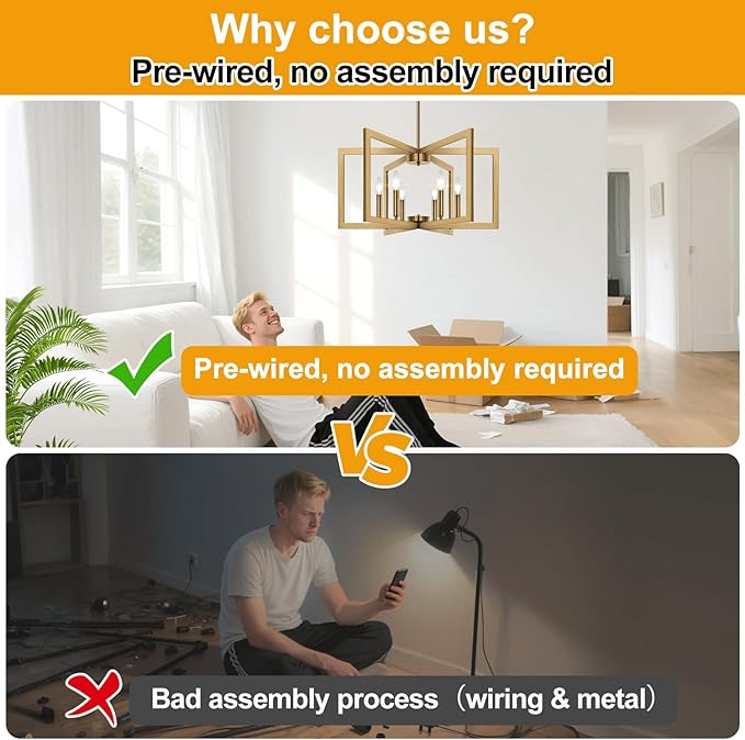 - 【Partially pre-assembled & Easy Installation】The lamp arms come pre-assembled—simply unfold them and connect two frames to complete the assembly of your brass chandelier, assembly is a breeze! Besides, the dining room light fixture comes with all the necessary parts and detailed instructions for hassle-free installation.