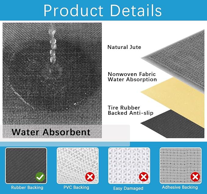 - Water Absorbent: Jute hall mat with absorbent non-woven fiber fabric inter layer to provide the runner rugs with strong water absorption, for the surface of long runner mat are made of low pile jute, so hallway runner will not be entangled with the sweeping robot, then you can open and close the door arbitrarily, just put the thickness 0.3" of runner behind the door.