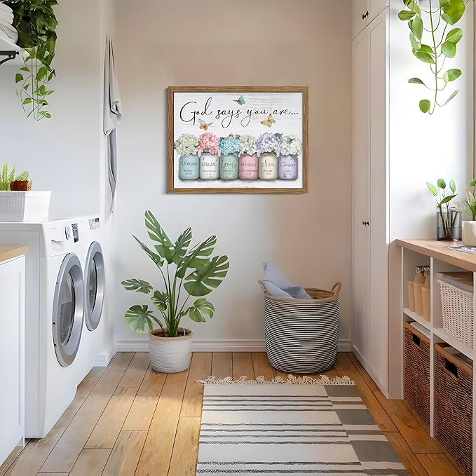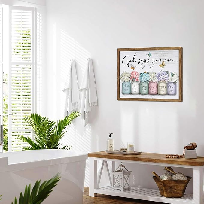Wood Framed Inspirational Bible Verse Wall Art, Christian God Says You Are Wall Decor Paintings, Farmhouse Scripture Mason Jar Flower Pictures Posters Prints for Bathroom Bedroom Home Decor 12x16 Inch