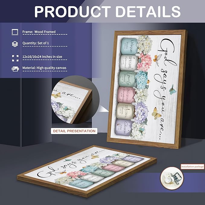 - 【 Christian with Bible Verses Wall Art 】Featuring the beloved “God Says You Are” theme, this scripture wall art delivers daily reminders of your worth and identity in Christ. Each inspiring word is paired with soft floral artwork and uplifting design—perfect for those seeking Christian wall decor that blends faith with beauty.