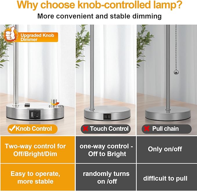 - Upgraded Stepless Dimming: Our gold table lamps have a smooth-turning dimmer switch, allowing easy brightness adjustment from high to low, including direct lamp turn-off. This sets our lamps apart from touch control alternatives that require cycling through all settings to turn off. With these upgrades, our brushed nickle lamps offer a more efficient and user-friendly experience