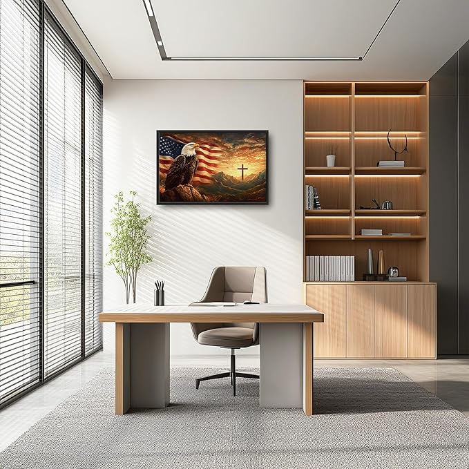 Framed Large Wall Art for Living Room, Bald Eagle American Flag Canvas Wall Decor, Large Christian Cross Picture Framed Painting, Modern Artwork for Bedroom Office 36L'' × 24W''