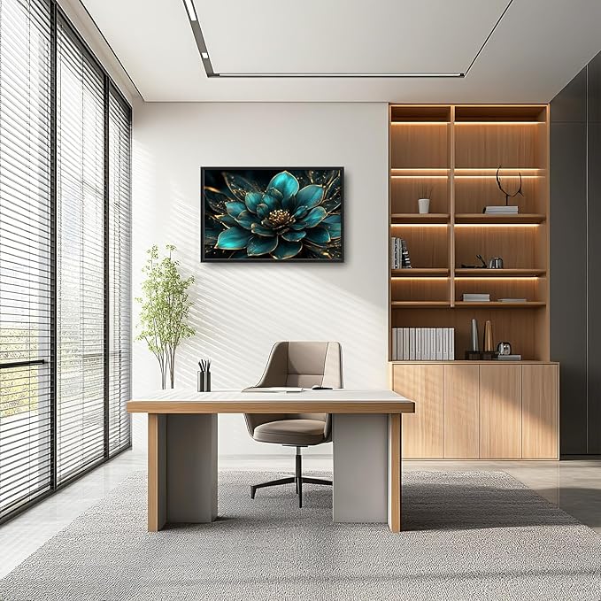 Framed Large Wall Art for Living Room, Teal Flower Canvas Wall Decor, Large Picture Framed Painting, Modern Artwork for Bedroom Office Home Decor 36L'' × 24W''