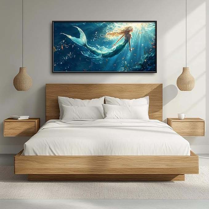 Framed Large Wall Art for Living Room, Beach Mermaid Canvas Wall Decor, Large Ocean Picture Framed Painting, Modern Artwork for Bedroom Office 60L'' × 30W''