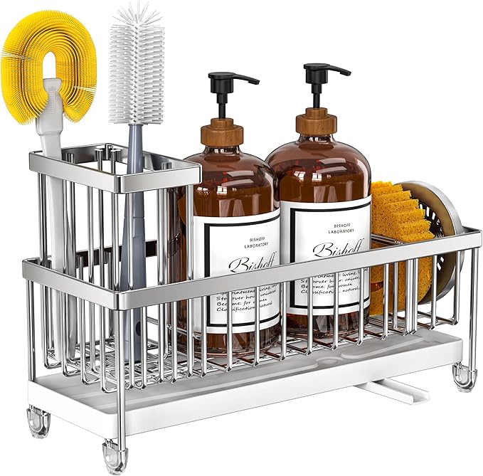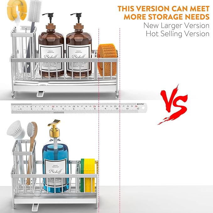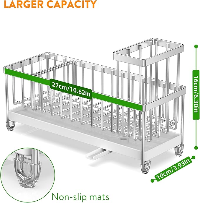 - 【LARGER CAPACITY】Cisily kitchen sink organizer is longer in length: 10.62 inch. So this sink caddy provides larger storage space and hold more cleaning accessories: dish soap dispenser x1, hand soap dispenser x1, sponge x1, some brushes.