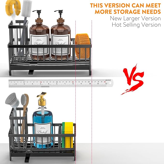 - 【LARGER CAPACITY】Cisily kitchen sink organizer is longer in length: 10.62 inch. So this sink caddy provides larger storage space and hold more cleaning accessories: dish soap dispenser x1, hand soap dispenser x1, sponge x1, some brushes.