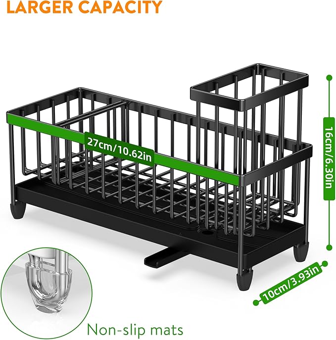 - 【STABLE DRAIN TRAY & AUTOMATIC DRAINAGE】The drain tray is fixed to the frame, so it won't come loose and drop when is use. Sloped design ensures fast drainage. This sink caddy is great for holding all the cleaning things and keeping water off the counter.
