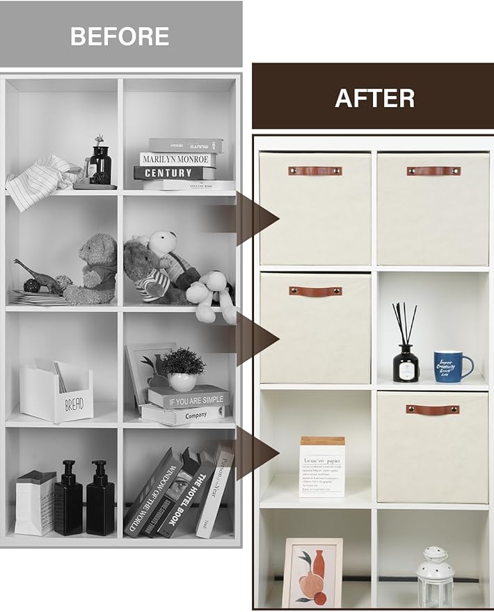 - STURDY HANDLE: Each cube organizer bin has 2 sturdy handles so that when we place the storage baskets on the shelf, the fabric storage baskets can be used as a drawer. Pulling the handle makes it easier to access the contents of the cube box.