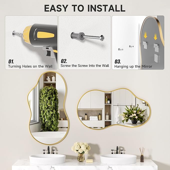 - BIDIRECTIONAL SUSPENSION - Our bathroom asymmetrical mirror frame is equipped with 3 hooks, giving it the function of bidirectional suspension. You can easily and stably install the mirror by accurately punching holes in the corresponding positions on the selected wall according to your actual installation space and personal usage habits, without the need for complex installation processes, saving you time and energy.