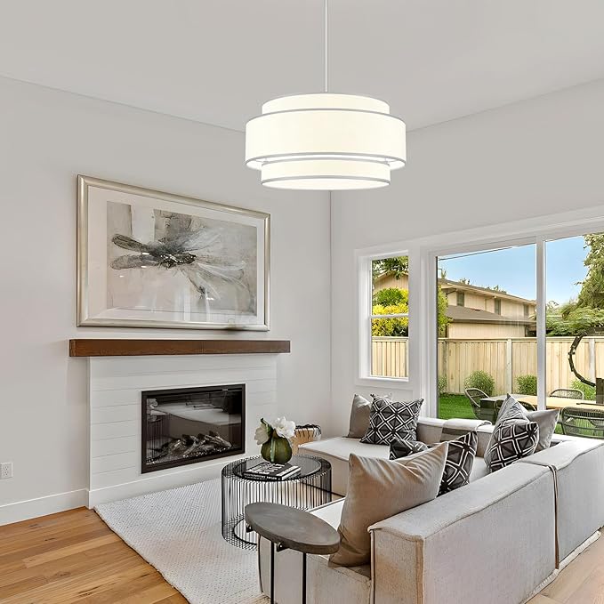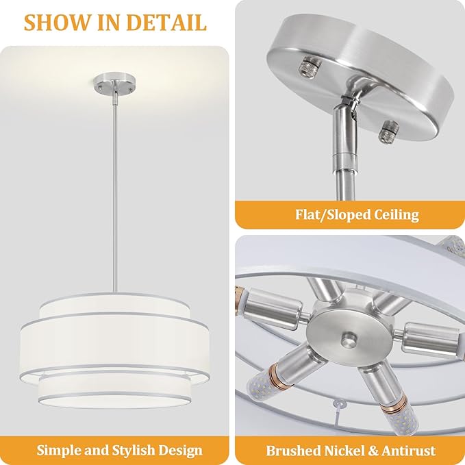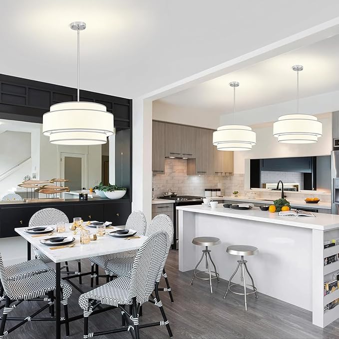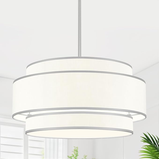 - ✨3-TIERS DRUM SHADE CHANDELIER DESIGN--Crafted with 3-layers of circular fabric lampshades and a robust,rust resistant brushed nickel metal frame, this modern dining room chandelier(ideal for placement above dining tables) not only boosts visual attraction but also scatters light evenly.As light filters through the fabric lampshade, it casts a soft, glowing radiance, fostering a warm and inviting atmosphere that fabric pendant light adds a touch of natural texture to your dining area’s decor.