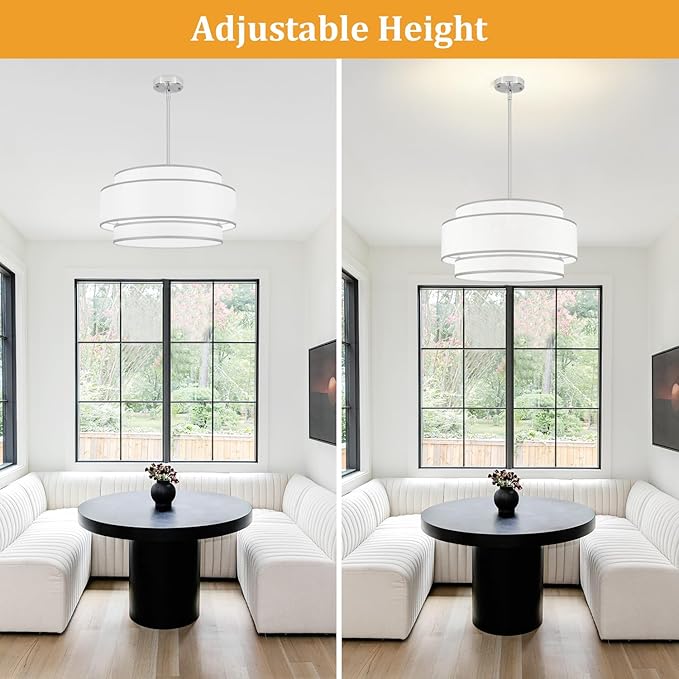 - ✨NO ASSEMBLY REQUIRED & ADJUSTABLE HEIGHT--This brushed nickel chandeliers for dining room is simple to install and can be quickly mounted on standard ceilings.The drum chandelier included hardware and clear instructions make the installation process straightforward--just secure the lamp holder and lampshade together, then attach the fixture to your home’s circuit and install the bulbs to enjoy your perfect chandelier.Our modern farmhouse chandelier unlike chain hung alternatives,it uses connecting rods for improved stability and less sway.Drum bedroom chandelier equipped with 4 detachable rods,lets you adjust the hanging height to suit your space’s needs.