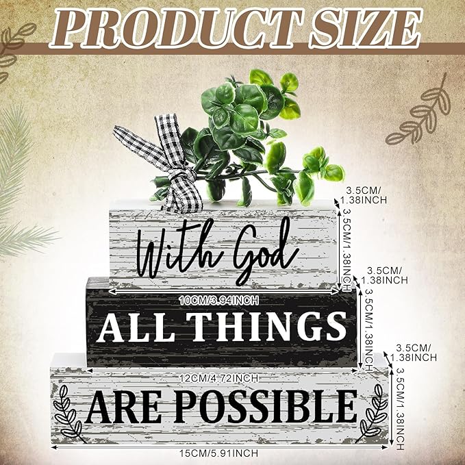 - Suitable Sizes for Ideal Placement: the wooden table decors come in 4 different sizes; The christian signs measures 3.62 x 2.09 inches, while the standing blocks measure 3.94 x 1.38 inches, 4.72 x 1.38 inches, and 5.91 x 1.38 inches; Whether you place rustic table decors on your dining table, layered tray, or mantelpiece, they are ensured to catch anyone's eye quickly