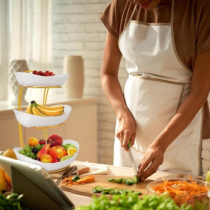 3 Tier Fruit Bowls for Kitchen Counter, White Ceramic Serving Bowls with Gold Metal Stand, Tiered Fruit Basket Display Rack for Fruits Vegetable Snack Nuts Cake Dessert Storage
