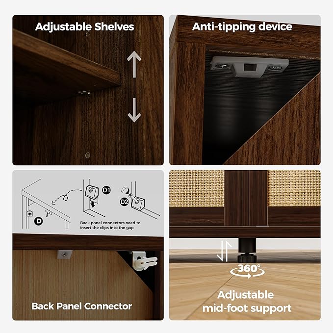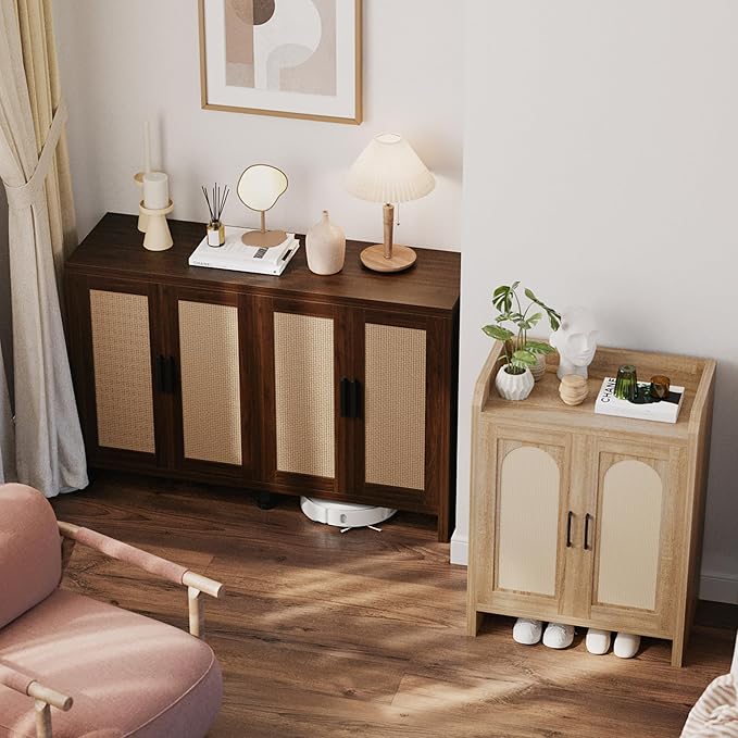 - 【Bohemian design】 This credenza storage cabinet is equipped with 4 design rattan wood doors, kitchen sideboard with black metal handles, adding a unique sense of fashion and charm to the product. The spacious top countertop can be used as a cooking table or to store tableware, etc., keeping the kitchen clean and tidy.