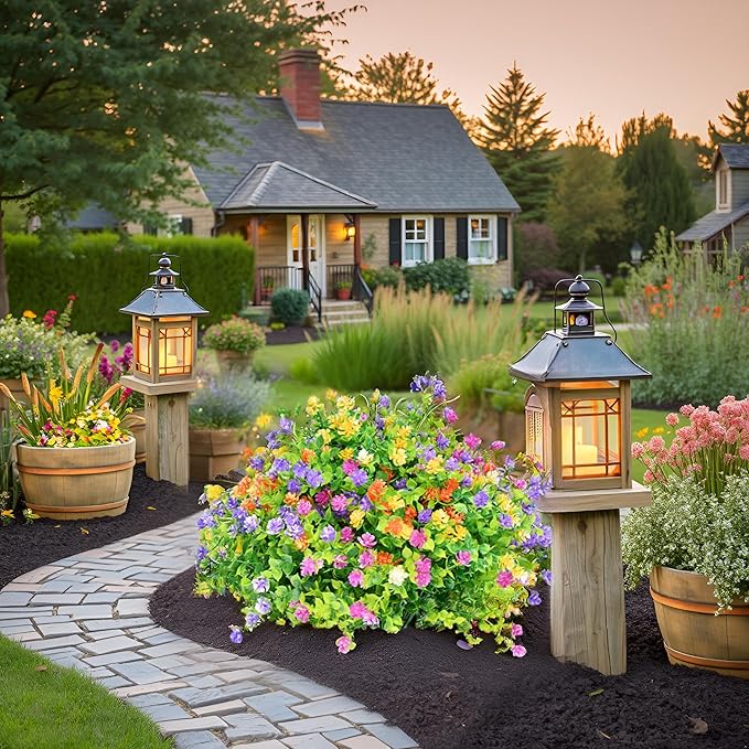 - REALISTIC DESIGN: Features vibrant multi-colored blooms in purple, pink, orange, and yellow with lush green foliage for a natural garden appearance