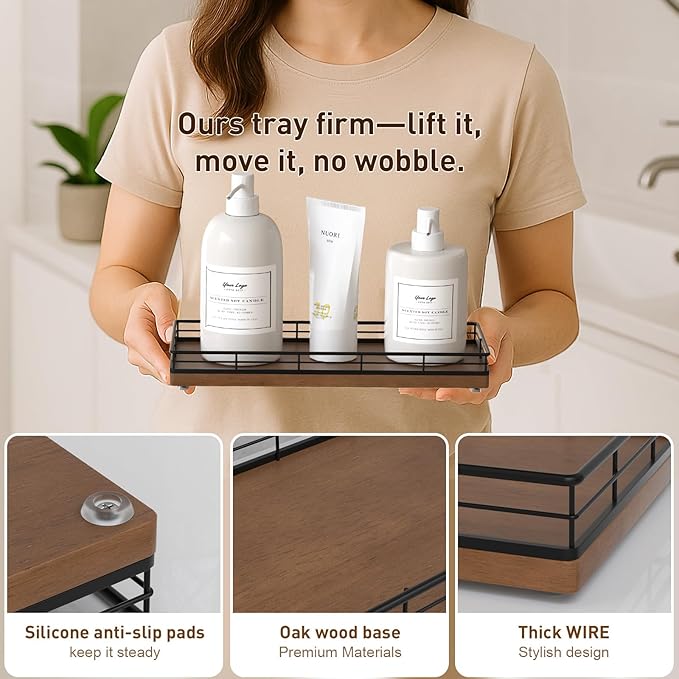 Bathroom Tray for Counter Top Organizer – Oak Wood Vanity Tray with Metal Frame for Dresser, Kitchen, Nightstand – Black & Brown Decorative Storage