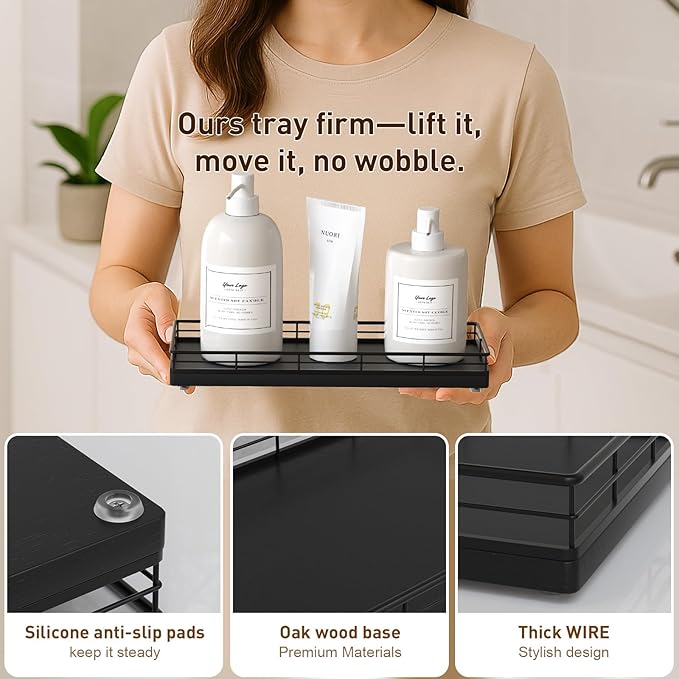 Bathroom Tray for Counter Top Organizer – Oak Wood Vanity Tray with Metal Frame for Dresser, Kitchen, Nightstand – Black Decorative Storage