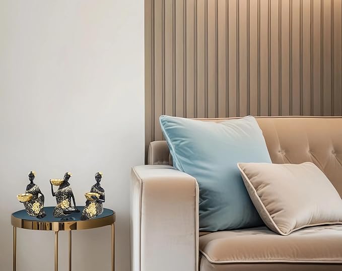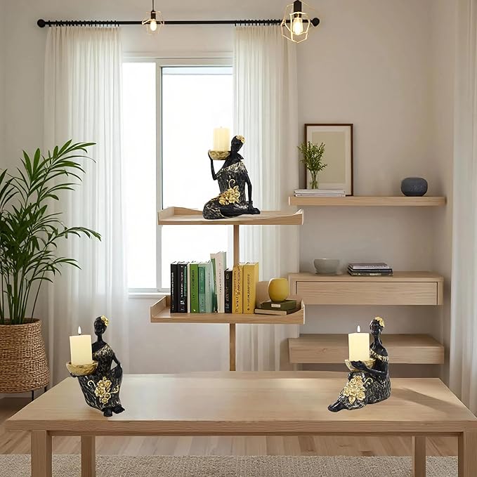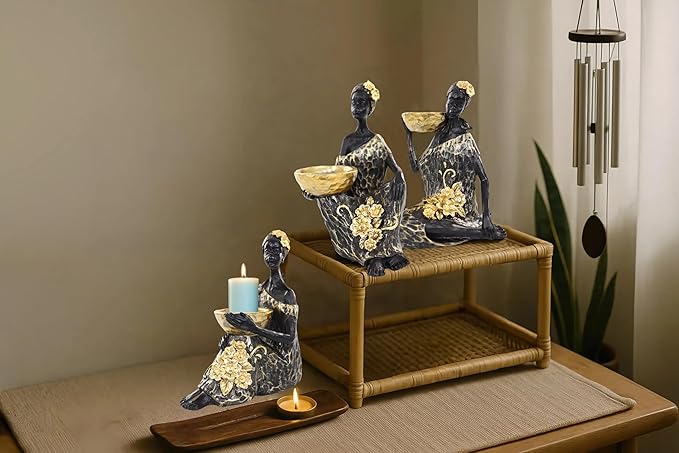 African Lady Candle Holder Set of 3 โ Resin Figurines with Gold Bowls for Tea Light or Small Pillar Candles โ Decorative African Women Statues for Home, Shelf, or Table Centerpiece