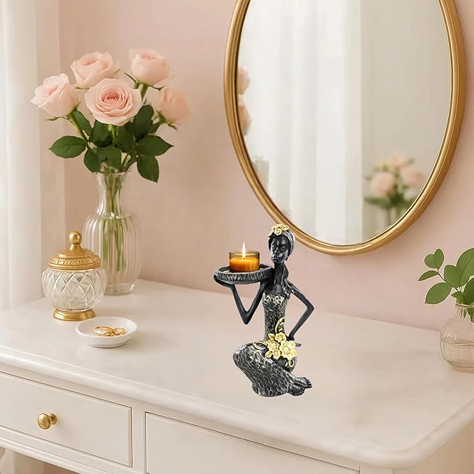 African Lady Figurine Candle Holder with African Tribal Totem for Wedding,Church,Holiday Decor-African Decorative Women Statues, Candlestick Holder for Home and Table Decor(405-Black)