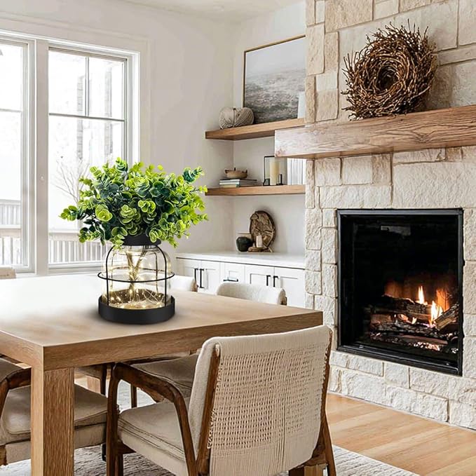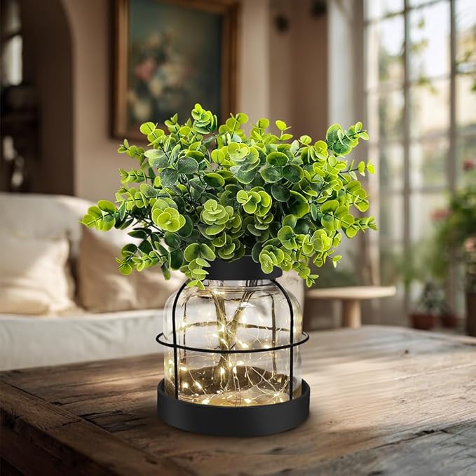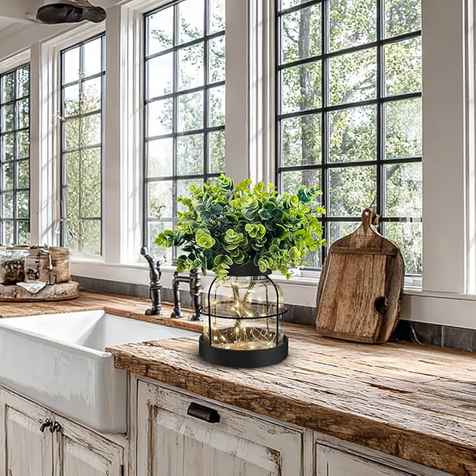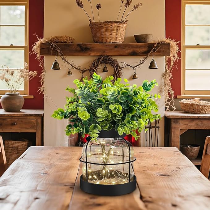 - Farmhouse Decor Design: The rustic vase features thick glass jar wrapped by rustic metal iron frames, including artificial Eucalyptus greenery and 13.12FT lights strings(batteries not included); It will create country style to your home