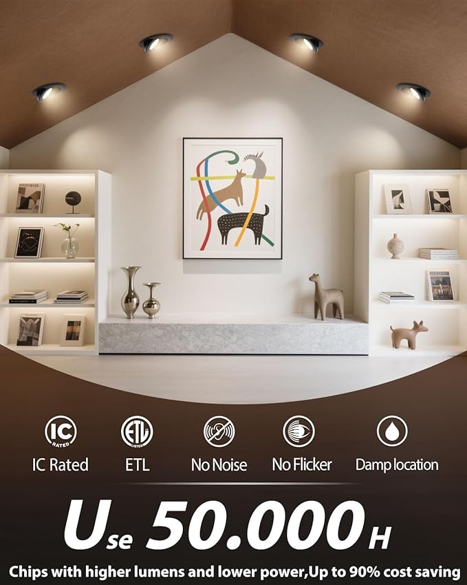 zouzai Second Generation 5CCT LED Gimbal Led Recessed Light with Junction Box, 360ยฐ+90ยฐ Adjustable Directional Eyeball Lighting, Dimmable, 2700K-5000K,ETL&Energy Star (Black 12 Pack, 4 inch)