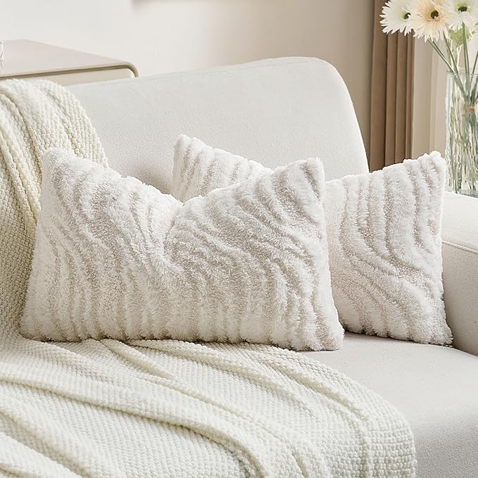 FUTEI White Decorative Throw Pillow Covers 12x20 Inch Set of 2,Soft Faux Fur Geometric Shapes Texture Pillowcase,Boho Home Decor for Couch Bed Living Room