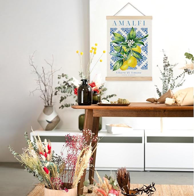 Yomisex Italian Amalfi Coast Lemon Wall Art Poster, Blue and White Floral Mediterranean Tiles Lemons Tree Canvas Prints Wall Art Framed for Home Kitchen Dining Room Decor, 12x16 Inch