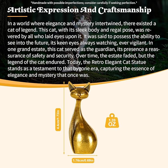 - Charming Vintage Brass Design: Unveil the Retro Elegant Cat Statue, a sleek masterpiece crafted from solid 100% brass, capturing the essence of timeless elegance. Each curve and line of this cat statue is a testament to the craftsmanship and dedication of artisans who breathed life into this regal creation.
