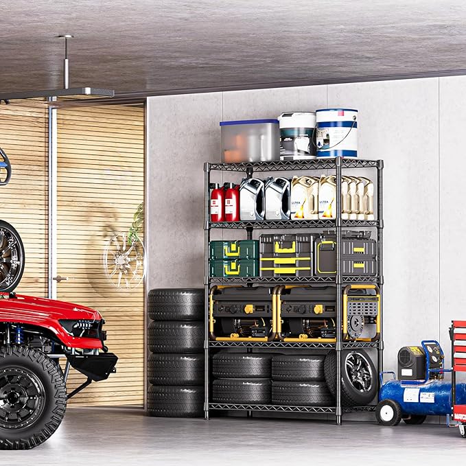 - 【Heavy-Duty Carbon Steel – Ultra-Stable Design】Built with premium carbon steel and 22.22mm reinforced pipes, this shelving rack is engineered for strength and durability. Each shelf supports up to 350 lbs, with a total capacity of 1750 lbs, offering solid support for your heavy tools, appliances, or storage bins.