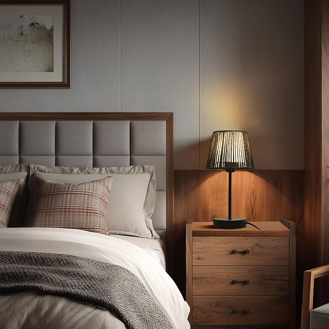 - 【Bedside Lamp with Soft Light】 The E26 LED bulb (included) gives a 3000K soft warm mood light. The double layer lampshade distributes the light evenly compared with other rope lights or rattan lamps, No glare. 6.5W LED bulb has a lifespan of over 10,000 hours. No flickering, no buzzing and less heat output