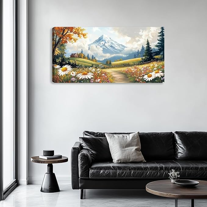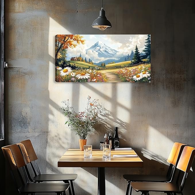 Mountain Canvas Wall Art Wall Decor Large Wildflowers Landscape Wall Art Poster Pictures Painting for Living Room for Bedroom Home Framed Farmhouse Decorations Artwork 48L x 24W
