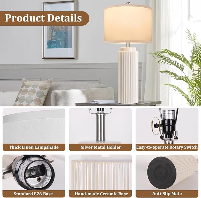 - 【Ceramic Table Lamps Set of 2】The ceramic living room lamps are designed with an exquisite cream polished process and a unique vertical stripe pattern, which can easily fit into most decorative styles such as modern, classic, country, vintage, farmhouse, Northern Europe, boho, and more. Carefully selected high-quality ceramic materials make the table lamps durable, scratch-resistant, and fading-resistant. As a result, the ceramic table lamps can always keep their magnificent appearance