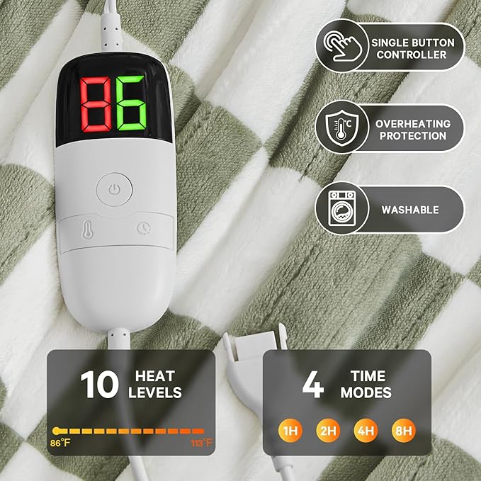 - SAGE GREEN GIFTS WITH A TWIST: The heated blanket twin elevate your space with the sage green checkered pattern, blending rustic charm with modern minimalism. The 50x60 size offers enough coverage for lounging moments. Its cozy warmth provides a comforting touch during chilly seasons, ensuring the home feels like a true haven. This checkered blanket is also suitable for the living room as a decor or as a warming gifts for birthday, Christmas, or housewarming.
