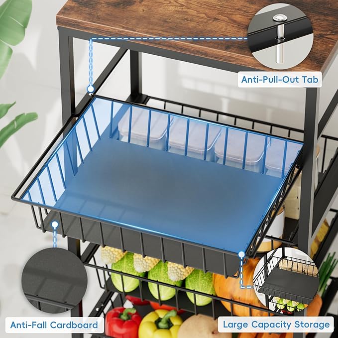 - 【Versatile Vegetable & Fruit Basket Cart】 This 5-tier vegetable basket cart doubles as a fruit basket stand and pantry cart. Organize produce, snacks, and kitchen essentials with pull-out baskets for easy access. The wooden top adds counter space while keeping potatoes, onions, and appliances within reach - perfect as kitchen storage cart for homes with limited space.