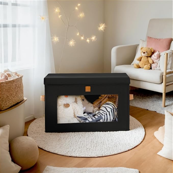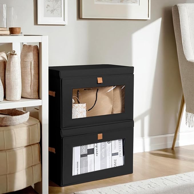Collapsible Storage Bins - Large Stackable Organizer Bins, Decorative Boxes with Handles & Window, Fabric Containers for Living Room, Closet, Dorm, 2 Pack, Black