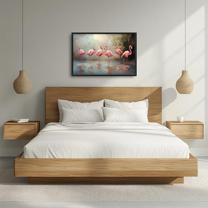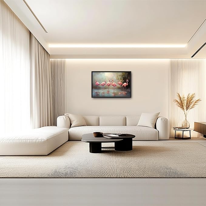 Flamingo Framed Wall Art for Living Room, Large Pink Birds Canvas Wall Decor, Animal Lake Pictures Painting, Modern Artwork for Bathroom Bedroom 36L'' × 24W''