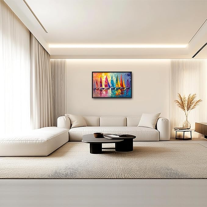 Large Coastal Sailboat Framed Wall Art for Living Room, Colorful Sailboats Canvas Wall Decor, Vintage Nautical Pictures Painting, Modern Landscape Artwork for Bedroom 36L'' × 24W''