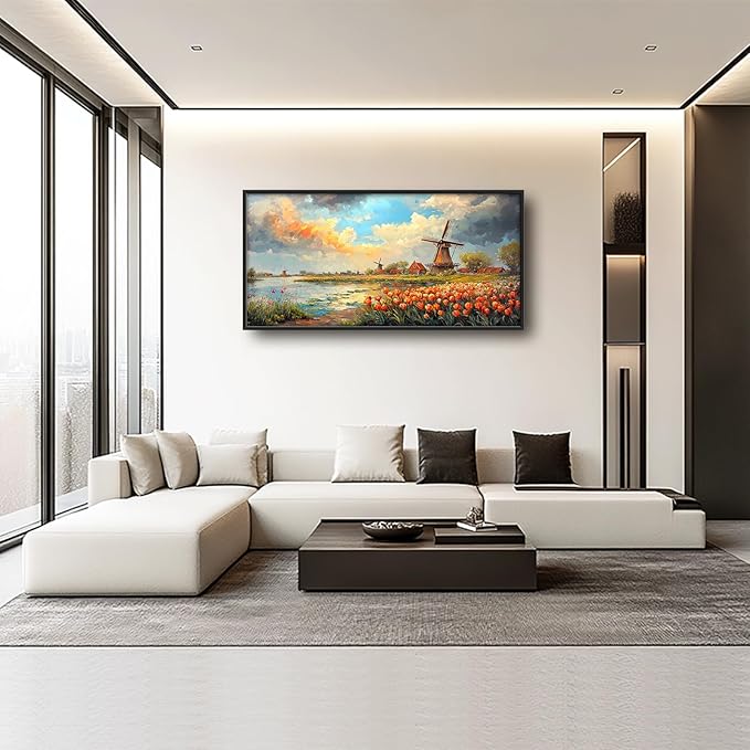 Windmill Framed Wall Art for Living Room, Large Tulips Canvas Wall Decor, Vintage Florals Pictures Painting, Farmhouse Artwork for Bathroom Bedroom 60L'' × 30W''