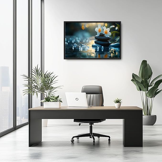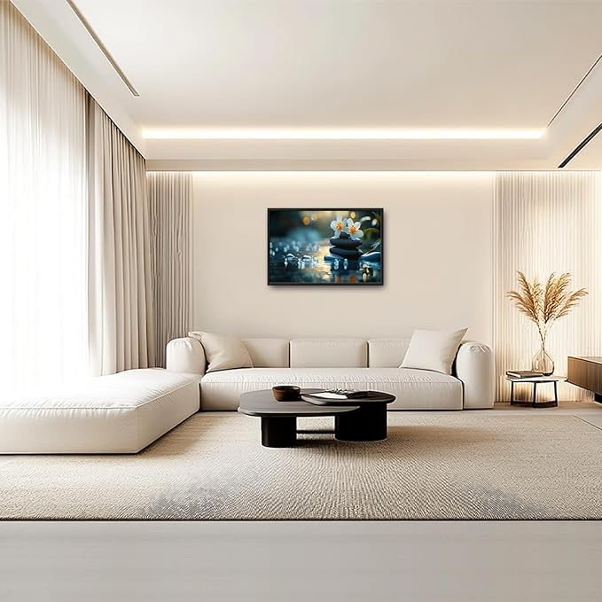 Zen Framed Wall Art for Living Room, Large Lotus Canvas Wall Decor, Stones in Water Landscape Pictures Painting, Modern Artwork for Spa Bathroom Bedroom 36L'' × 24W''