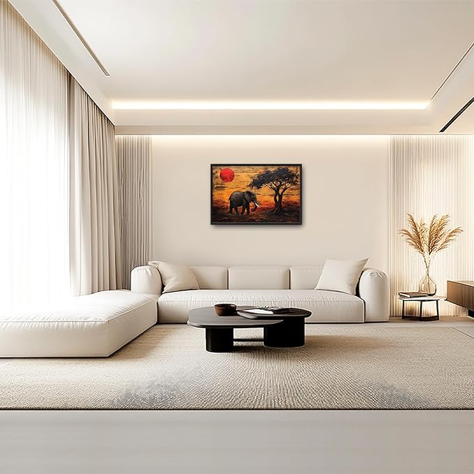 Elephant Framed Wall Art for Living Room, Large African Elephant Canvas Wall Decor, Wild Animal Sunset Picture Painting, Modern Artwork for Bathroom Bedroom 36L'' × 24W''