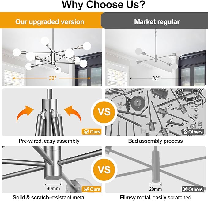 - Easy Installation: This chandeliers for dining room features pre-wired frames that does not require much assembly—just simply connect the rods and arms! The modern chandelier includes all necessary components and comes with clear, easy-to-follow instructions for a smooth, hassle-free installation process.