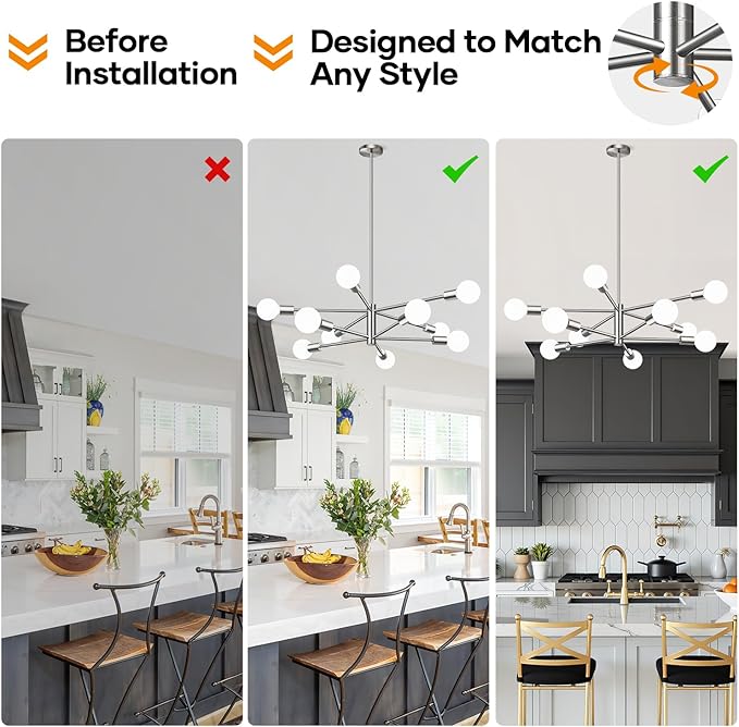 - Adjustable Height: Featuring 4 splicing rods, this sputnik ceiling light fixture can be adjusted from 17.0" to 52.3" in height to meet any lighting need, providing stability and reducing shaking. This chandelier for living room is suitable for both sloped and flat ceilings, adapting to diverse room designs.