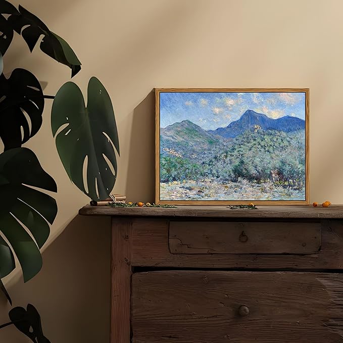 Vintage Framed Monet Wall Art – Impressionist Blue Green Forest Oil Painting Canvas Prints – Tranquil Nature Hillside Landscape Aesthetic Wall Decor for Living Room Bedroom Bathroom – 8"x10"