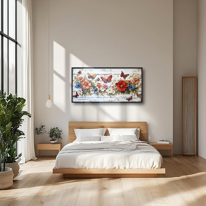 Olivine Flower Large Wall Art, Butterfly Pictures Wall Decor, Boho Painting, Rustic Wood Grain Canvas Prints, Framed Artwork for Dining Room Living Room Bedroom Bathroom Office Home Decor 60"x30"