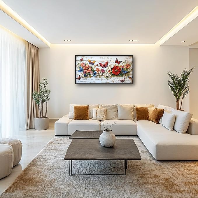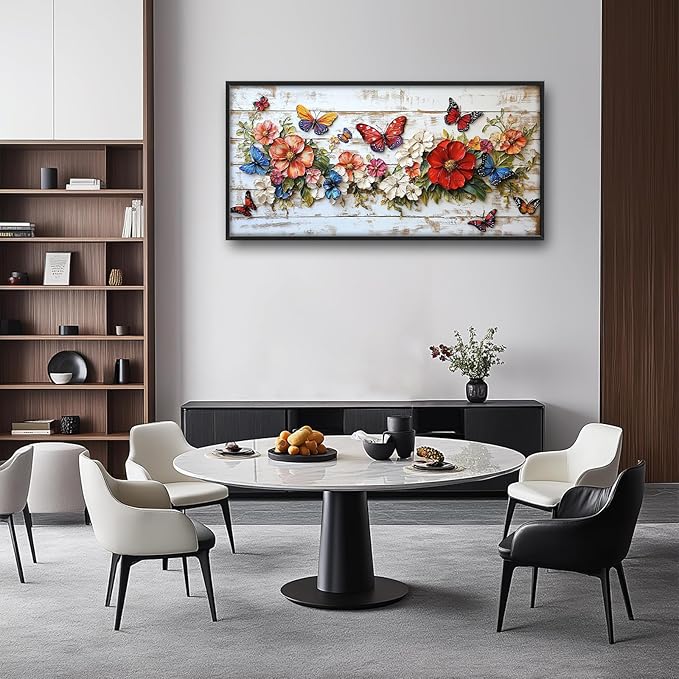 Olivine Flower Large Wall Art, Butterfly Pictures Wall Decor, Boho Painting, Rustic Wood Grain Canvas Prints, Framed Artwork for Dining Room Living Room Bedroom Bathroom Office Home Decor 36"x24"