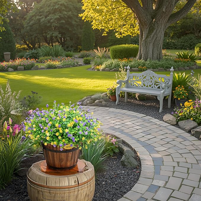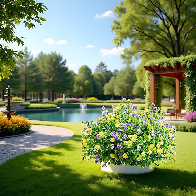 - VERSATILE DECOR: 12 bundles of artificial flowers featuring vibrant purple and yellow blooms with lush green foliage, perfect for outdoor and indoor decorative arrangements