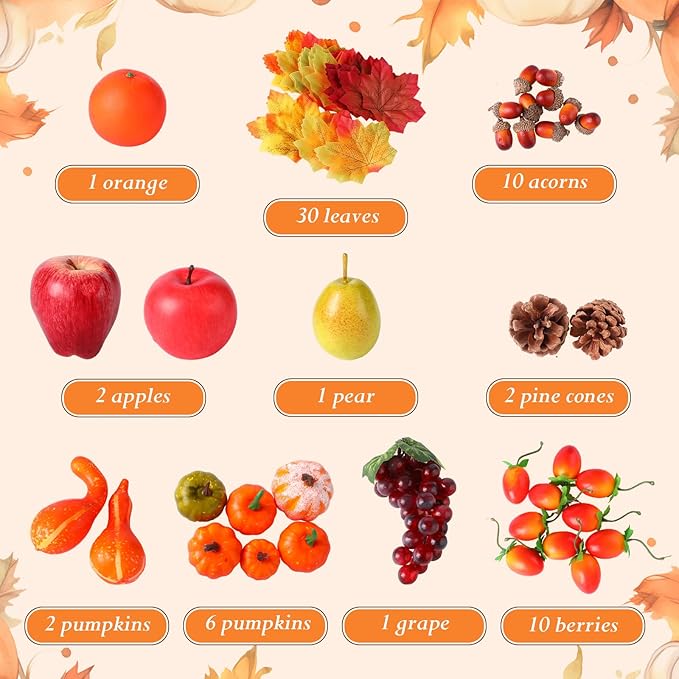 - Comprehensive Decoration Set: this robust fall tabletop decor set Includes you need: 1 cornucopia, 8 pumpkins, 30 maple leaves, 2 pine cones, 10 pine nuts, and 5 different fruits; Primarily made of lightweight foam, it also features 10 crystal stickers with good wishes, enabling you to create a personalized and heartfelt decorative experience