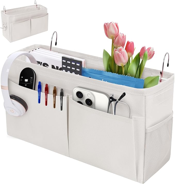 Bedside Caddy Organizer with Fixed Straps, Bunk Bed Caddy ideal for Home, Bunk Bed, Dorm, Hospital, Crib, Versatile Bedside Storage Solution (Beige)